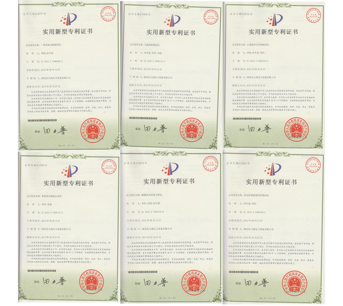 2013年2月,湖北儀天成電力設備有限公司自主研發的直流電阻測試儀、互感器綜合特性測試儀、電纜故障測試儀、智能型電纜耐壓系統、斷路器動特性分析儀、氧化鋅避雷器特性分析儀共6種產品再榮獲國家知識產權局頒發的實用新型專利證書。