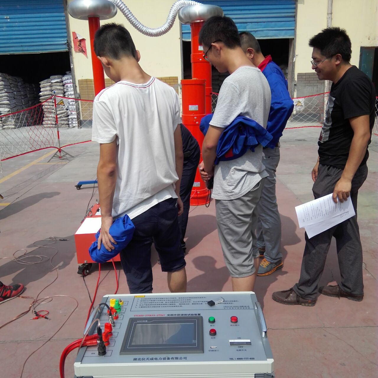 李工很快抵達現場,與客戶進行面對面的交流,了解客戶的需求和想法。然后開始講解設備,并認真講解怎樣安全操作設備。確保客戶明白了安全操作以后,李工帶領客戶一起做試驗——YTC850-270kVA/270kV變頻串聯諧振試驗裝置,YTCDG-1000A大電流發生器 這2套設備,其中這套變頻串聯諧振試驗裝置我公司的該設備為專利產品,諧振電源調頻及功率元件使用先進的日本進口的優質元器件,設計的是諧振式濾波電路,能改善輸出電壓的波形畸變,獲得很好的正弦波形,有效的防止了諧波峰值對試品的誤擊穿。變頻電源保護功能強,穩定性好;具備具備全自動(自動調諧、自動升壓)、全手動(手動調諧、手動升壓)以及半自動(自動調諧、手動升壓及手動調諧、自動升壓)的多種工作模式,可任意切換使用;操作方便。